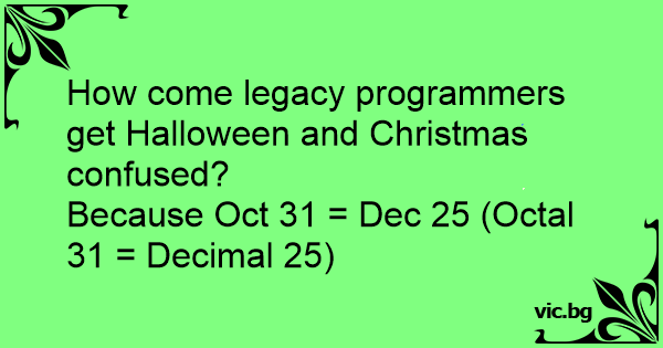 - Kodėl programuotojai kartais maišo Helovyną su Kalėdomis? - Nes Oct 31 lygu Dec 25.