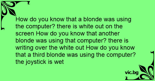 How do you know that a blonde was using the computer? there is white out on the screen How do you know that another blonde was using that computer? there is writing over the white out How do you know that a third blonde was using the computer? the joystick is wet