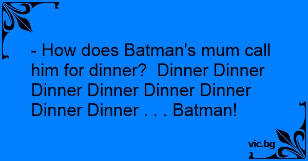 - How does Batman's mum call him for dinner? Dinner Dinner Dinner Dinner Dinner Dinner Dinner Dinner . . . Batman!