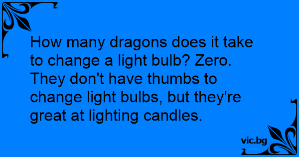 How many dragons does it take to change a light bulb? Zero. They don't have thumbs to change light bulbs, but they're great at lighting candles.