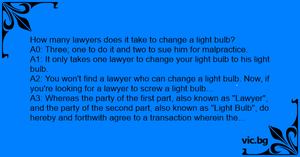 A2: You won't find a lawyer who can change a light bulb. Now, if you're looking for a lawyer to sсrеw a light bulb...