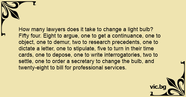 Fifty four. Eight to argue, one to get a continuance, one to object, one to demur, two to research precedents, one to dictate a letter, one to stipulate, five to turn in their time cards, one to depose, one to write interrogatories, two to settle, one to order a secretary to change the bulb, and twenty-eight to bill for professional services.
