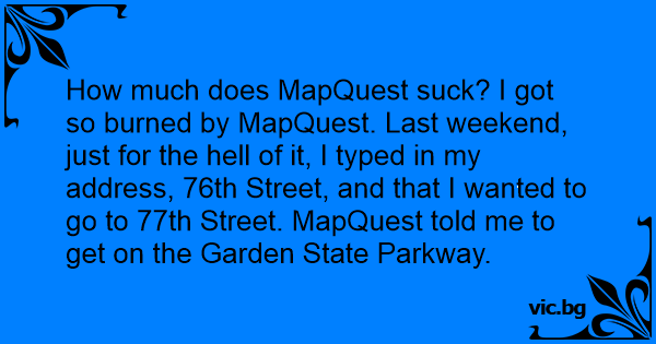 How much does MapQuest suск? I got so burned by MapQuest. Last weekend, just for the hеll of it, I typed in my address, 76th Street, and that I wanted to go to 77th Street. MapQuest told me to get on the Garden State Parkway.