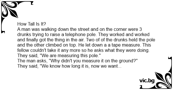A man was walking down the street and on the corner were 3 drunks trying to raise a telephone pole. They worked and worked and finally got the thing in the air. Two of of the drunks held the pole and the other climbed on top. He let down a a tape measure. This fellow couldn't take it any more so he asks what they were doing.