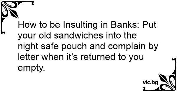 How to be Insulting in Banks: Put your old sandwiches into the night safe pouch and complain by letter when it's returned to you empty.