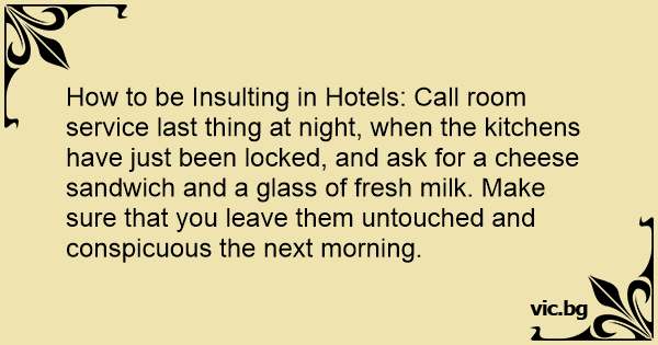 How to be Insulting in Hotels: Call room service last thing at night, when the kitchens have just been locked, and ask for a cheese sandwich and a glass of fresh milk. Make sure that you leave them untouched and conspicuous the next morning.