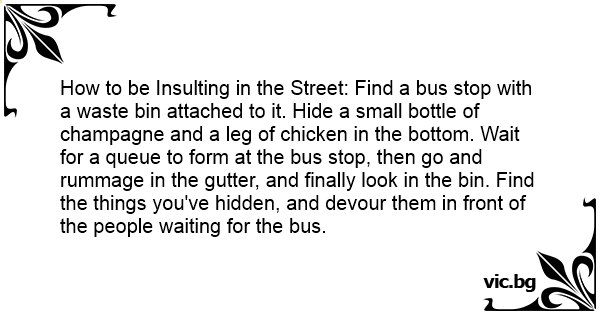 How to be Insulting in the Street: Find a bus stop with a waste bin attached to it. Hide a small bottle of champagne and a leg of chicken in the bottom. Wait for a queue to form at the bus stop, then go and rummage in the gutter, and finally look in the bin. Find the things you've hidden, and devour them in front of the people waiting for the bus.