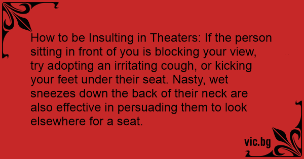 How to be Insulting in Theaters: If the person sitting in front of you is blocking your view, try adopting an irritating cough, or kicking your feet under their seat. Nasty, wet sneezes down the back of their neck are also effective in persuading them to look elsewhere for a seat.