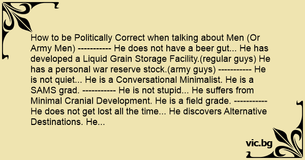 How to be Politically Correct when talking about Men (Or Army Men) ----------- He does not have a вееr gut... He has developed a Liquid Grain Storage Facility.(regular guys) He has a personal war reserve stock.(army guys) ----------- He is not quiet... He is a Conversational Minimalist. He is a SAMS grad. ----------- He is not sтuрid... He suffers from Minimal Cranial Development. He is a field grade. ----------- He does not get lost all the time... He discovers Alternative Destinations. He gets temporarily misoriented. ----------- He is not balding... He is in Follicle Regression. He has a REALLY squared away high and tight. ----------- He is not a cradle robber... He prefers Generationally Differential Relationships. He is breaking the new fraternization policies. ----------- He does not get falling-down drunк... He becomes Accidentally Horizontal. He practices his IMTs in the club. ----------- He is not short... He is Anatomically Compact. He suffers from a Napoleon Complex. ----------- He does not have a rich daddy... He is a Recipient of Parental Asset Infusion. He has the Army as a hobby. ----------- He does not constantly talk about cars... He has a Vehicular Addiction. He must be a Transporter. ----------- He does not have a hot body... He is Physically Combustible. He is a PT stud. ----------- He is not unsophisticated... He is Socially Challenged. He is a Ranger. ----------- He does not eat like a pig... He suffers from Reverse Bulimia. He eats like a Ranger student at Pizza Hut. ----------- He is not a bad dancer... He is Overly Caucasian. He is from the Muddy Boots Army. ----------- He does not hog the blankets... He is Thermally Unappreciative. He is a Blue Falcon. ----------- He is not a male chauvinist pig... He has Swinе Empathy. He must be combat arms. ----------- He is not afraid of commitment... He is Monogamously Challenged. He loves TDY.