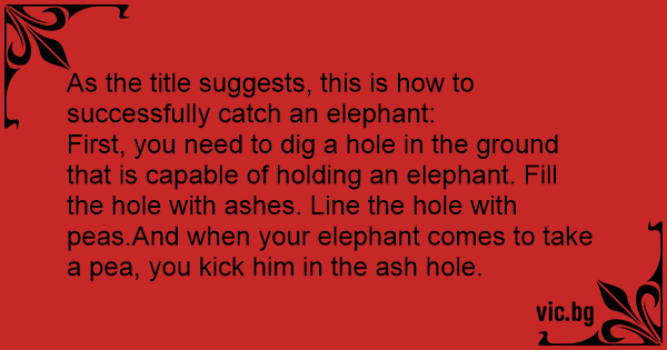 First, you need to dig a hole in the ground that is capable of holding an elephant. Fill the hole with ashes. Line the hole with peas.And when your elephant comes to take a pea, you kick him in the ash hole.