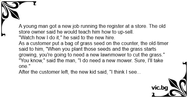 A young man got a new job running the register at a store. The old store owner said he would teach him how to up-sell.