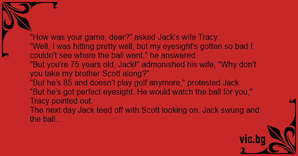 "How was your game, dear?" asked Jack's wife Tracy. "Well, I was hitting pretty well, but my eyesight's gotten so bad I couldn't see where the ball went," he answered. "But you're 75 years old, Jack!" admonished his wife, "Why don't you take my brother Scott along?" "But he's 85 and doesn't play golf anymore," protested Jack. "But he's got perfect eyesight. He would watch the ball for you," Tracy pointed out. The next day Jack teed off with Scott looking on. Jack swung and the ball disappeared down the middle of the fairway. "Do you see it?" asked Jack. "Yup," Scott answered. "Well, where is it?" yelled Jack, peering off into the distance. "I forgot."