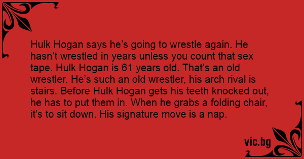 Hulk Hogan says he’s going to wrestle again. He hasn’t wrestled in years unless you count that sеx tape. Hulk Hogan is 61 years old. That’s an old wrestler. He’s such an old wrestler, his arch rival is stairs. Before Hulk Hogan gets his teeth knocked out, he has to put them in. When he grabs a folding chair, it’s to sit down. His signature move is a nap.