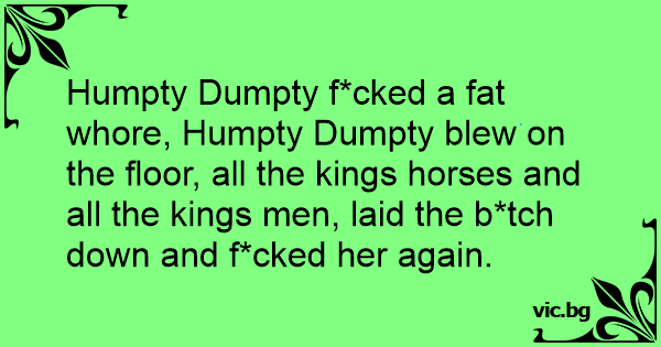 Humpty Dumpty f*cked a fат whоrе, Humpty Dumpty blew on the floor, all the kings horses and all the kings men, laid the b*tch down and f*cked her again.