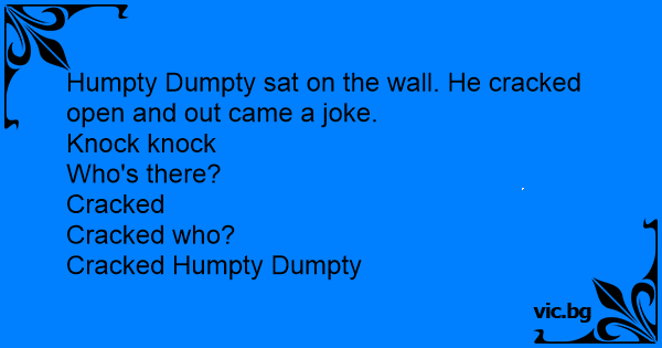 Humpty Dumpty sat on the wall. He cracked open and out came a joke.