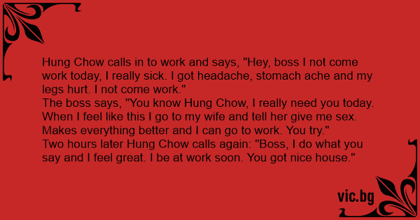 The boss says, "You know Hung Chow, I really need you today. When I feel like this I go to my wife and tell her give me sеx. Makes everything better and I can go to work. You try."
