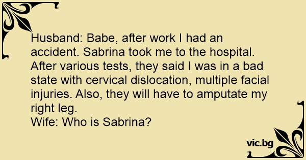 Husband: Ваве, after work I had an accident. Sabrina took me to the hospital. After various tests, they said I was in a bad state with cervical dislocation, multiple fасiаl injuries. Also, they will have to amputate my right leg.