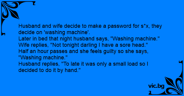 Husband and wife decide to make a password for s*x, they decide on 'washing machine'.