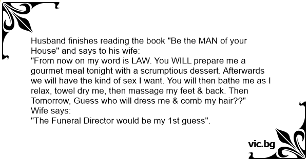 Husband finishes reading the book "Be the MAN of your House" and says to his wife: