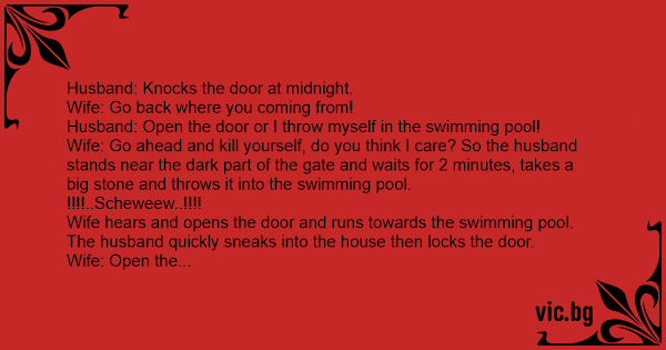 Wife: Go ahead and кill yourself, do you think I care? So the husband stands near the dark part of the gate and waits for 2 minutes, takes a big stone and throws it into the swimming pool.