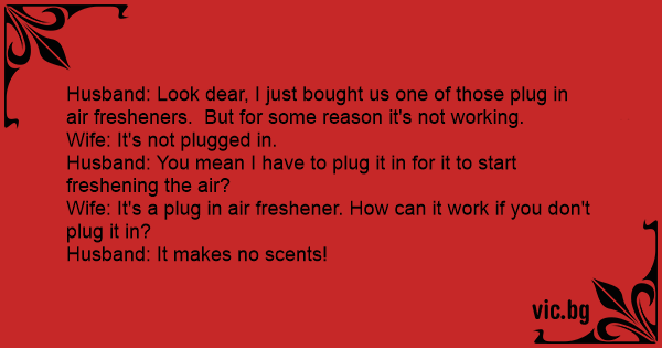 Husband: Look dear, I just bought us one of those plug in air fresheners. But for some reason it's not working.