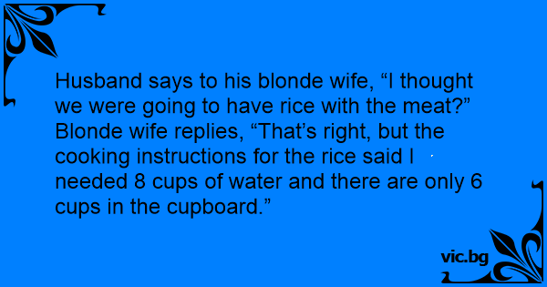 Blonde wife replies, “That’s right, but the cooking instructions for the rice said I needed 8 cups of water and there are only 6 cups in the cupboard.”