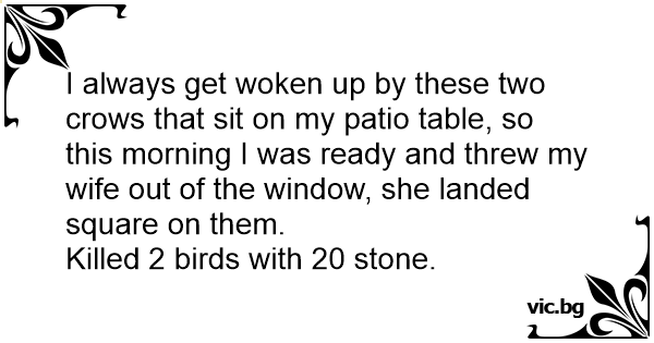 I always get woken up by these two crows that sit on my patio table, so this morning I was ready and threw my wife out of the window, she landed square on them.