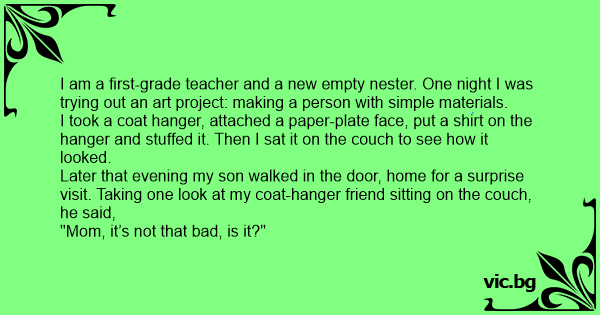Later that evening my son walked in the door, home for a surprise visit. Taking one look at my coat-hanger friend sitting on the couch, he said,