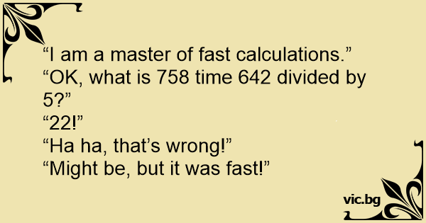 Ich bin ein Schnellrechenmeister." "OK, was ist 842 mal 354 geteilt durch 15?" "122!" "Ha ha, das ist falsch!" "Kann schon sein, aber es war verdammt schnell!"