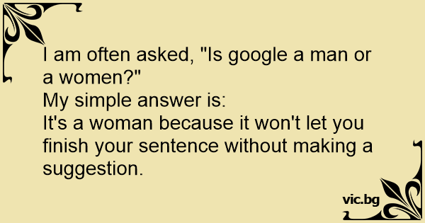 Q: Is Google male or female? A: Female, because it doesn't let you finish a sentence before making a suggestion.