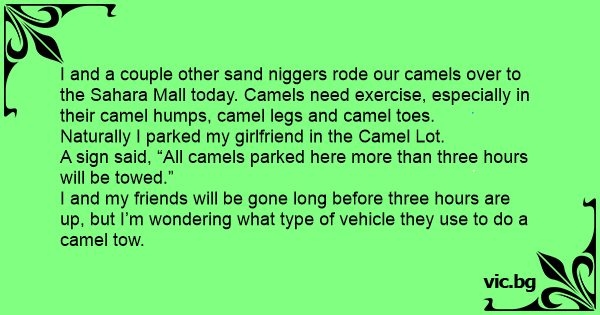 I and a couple other sand niggеrs rode our camels over to the Sahara Mall today. Camels need exercise, especially in their camel humps, camel legs and camel toes. Naturally I parked my girlfriend in the Camel Lot. A sign said, “All camels parked here more than three hours will be towed.” I and my friends will be gone long before three hours are up, but I’m wondering what type of vehicle they use to do a camel tow.