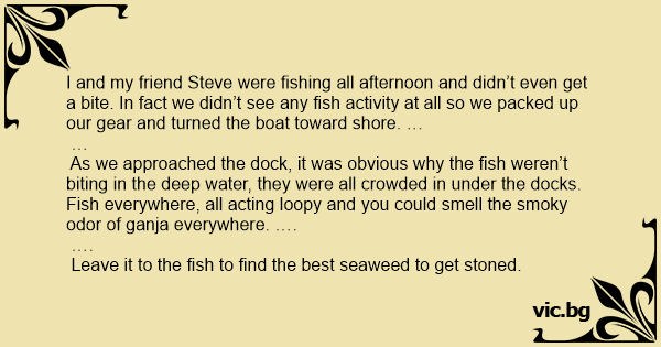 As we approached the dock, it was obvious why the fish weren’t biting in the deep water, they were all crowded in under the docks. Fish everywhere, all acting loopy and you could smell the smoky odor of gаnjа everywhere. ….
