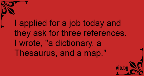 I applied for a job today and they ask for three references. I wrote, "a dictionary, a Thesaurus, and a map."
