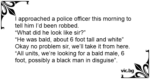 “All units, we’re looking for a bald male, 6 foot, possibly a black man in disguise”.