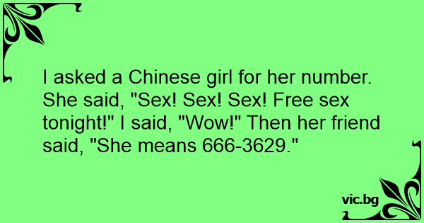 Jeg spurgte en kinesisk pige om hendes nummer. Hun svarede ”Sex! Sex! Sex! Free sex tonight” Jeg sagde ”Wow! ” Så sagde hendes veninde ”Hun mener 666-3629.”