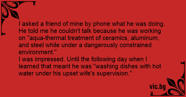 I asked a friend of mine by phone what he was doing. He told me he couldn't talk because he was working on "aqua-thermal treatment of ceramics, aluminum, and steel while under a dangerously constrained environment."