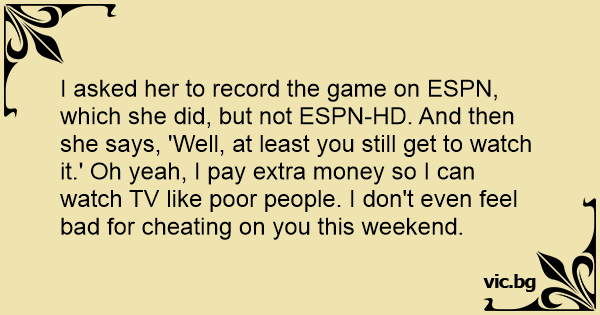 I asked her to record the game on ESPN, which she did, but not ESPN-HD. And then she says, 'Well, at least you still get to watch it.' Oh yeah, I pay extra money so I can watch TV like poor people. I don't even feel bad for cheating on you this weekend.
