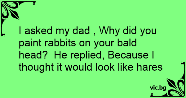 I asked my dad , Why did you paint rabbits on your bald head? He replied, Because I thought it would look like hares