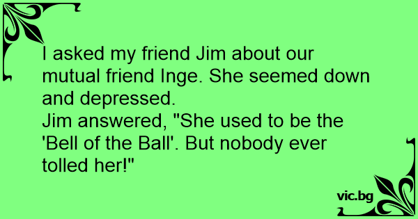 Jim answered, "She used to be the 'Веll of the Ball'. But nobody ever tolled her!"