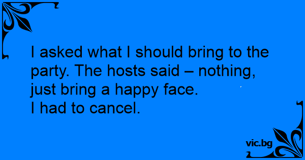 I asked what I should bring to the party. The hosts said – nothing, just bring a happy face.