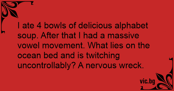 I ate 4 bowls of delicious alphabet soup. After that I had a massive vowel movement. What lies on the ocean bed and is twitching uncontrollably? A nervous wreck.