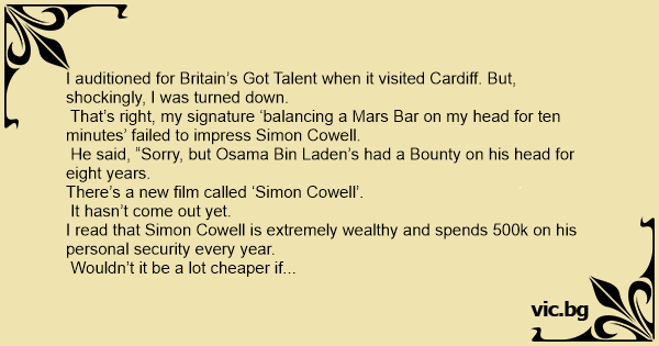 That’s right, my signature ‘balancing a Mars Bar on my head for ten minutes’ failed to impress Simon Cowell.