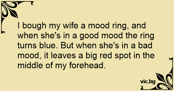 I bough my wife a mood ring, and when she's in a good mood the ring turns blue. But when she's in a bad mood, it leaves a big red spot in the middle of my forehead.