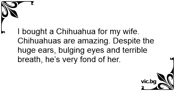 I bought a Chihuahua for my wife. Chihuahuas are amazing. Despite the huge ears, bulging eyes and terrible breath, he’s very fond of her.