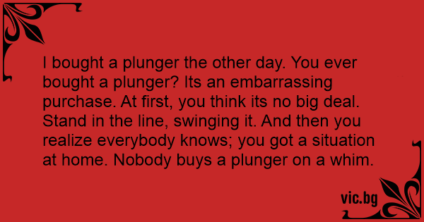I bought a plunger the other day. You ever bought a plunger? Its an embarrassing purchase. At first, you think its no big deal. Stand in the line, swinging it. And then you realize everybody knows; you got a situation at home. Nobody buys a plunger on a whim.