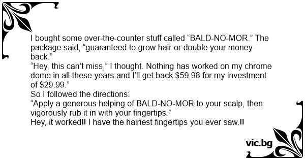 I bought some over-the-counter stuff called “BALD-NO-MOR.” The package said, “guaranteed to grow hair or double your money back.”