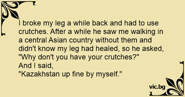 I broke my leg a while back and had to use crutches. After a while he saw me walking in a central Asian country without them and didn't know my leg had healed, so he asked,