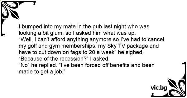 I bumped into my mate in the pub last night who was looking a bit glum, so I asked him what was up.