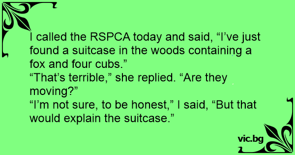 I called the RSPCA today and said, “I’ve just found a suitcase in the woods containing a fox and four cubs.”