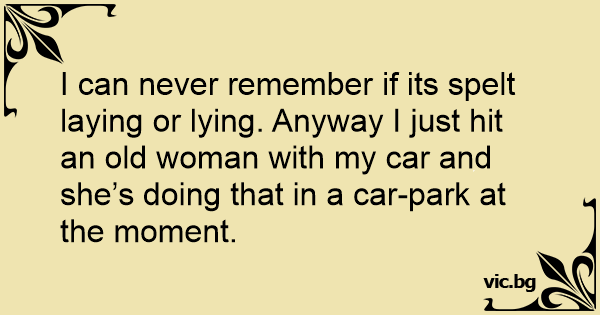 I can never remember if its spelt laying or lying. Anyway I just hit an old woman with my car and she’s doing that in a car-park at the moment.